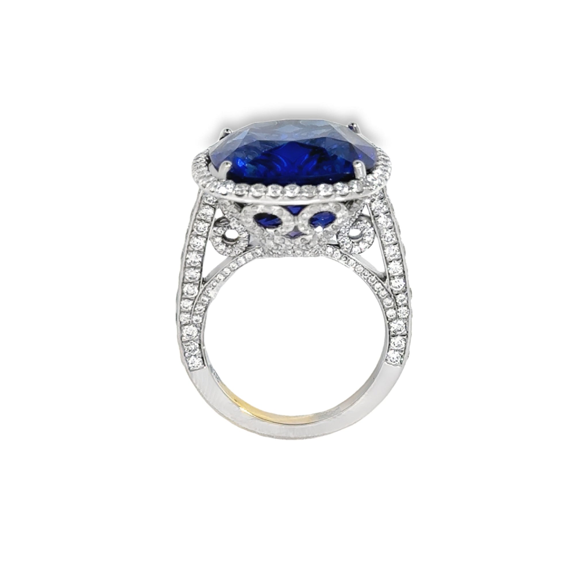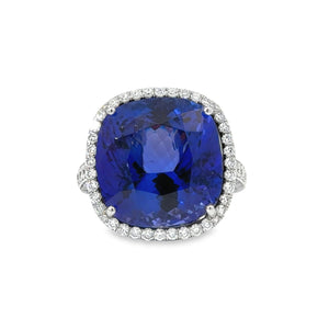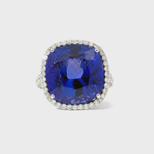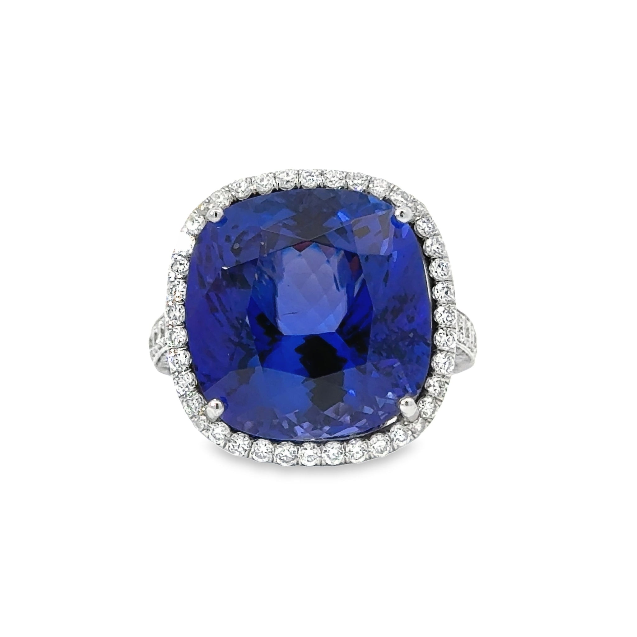 Gemstone Information17.72 Total Carat Cushion Tanzanite2.10 Total Carat Round Brilliant Cut Diamond Halo